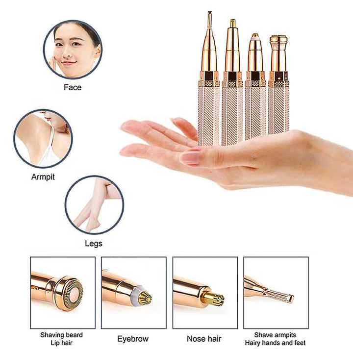 This 4i n1 Rechargeable Lady Shaver is designed to cater to various grooming needs, offering a convenient solution for removing nose hair, body hair, eyebrows, and facial hair with a single device.